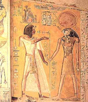 Within the next (second), level corridor, along with the text from the Litany of Re, are found the 74 forms of Re giving way to two scenes from spell 151 of the Book of the Dead. On the ceiling of this corridor is found the best preserved depiction of Isis and Nephthys as kites to either side of the soul of Re.