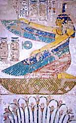 On the lintel above the doorway to the first true corridor we find the usual scene depicting a scarab and ram headed god flanked by Isis and Nephthys. On the outer thickness and reveals of the door jambs are found the name of the deceased king, along with inscribed prayers to the sun god and Osiris. On the inner thickness of the door jambs is a depiction of the goddess Ma'at, winged and kneeling on baskets supported by the heraldic plants of Upper and Lower Egypt.