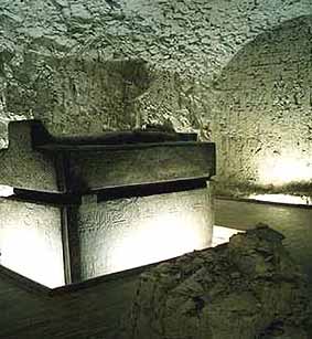 A final wider corridor leads past two abandoned lateral corridors before giving way into the unfinished, transverse burial chamber. Here, a granite sarcophagus is set into an roughly finished rectangular niche in the floor just behind a transverse row of four pillars. The abandoned lateral corridors may have been meant to give into a burial chamber or storage annexes, but this work was stopped after the a corridor broke into the nearby tomb, KV32. The openings were then sealed with limestone slabs.