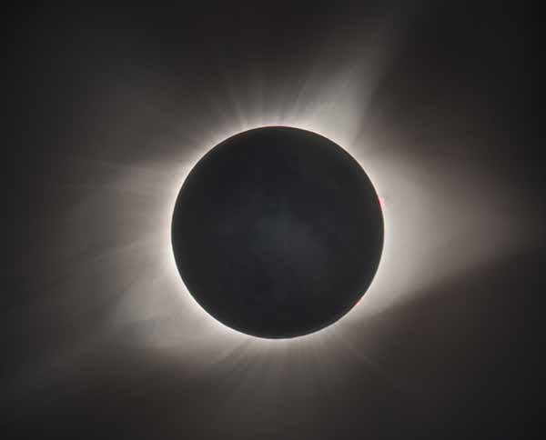 APOD - August 21, 2017Explanation: During a total solar eclipse, the Sun's extensive outer atmosphere, or corona, is an inspirational sight. Streamers and shimmering features visible to the eye span a brightness range of over 10,000 to 1, making them notoriously difficult to capture in a single photograph. But this composite of telescopic images covers a wide range of exposure times to reveal the crown of the Sun in all its glory. The aligned and stacked digital frames were taken in clear skies above Stanley, Idaho in the Sawtooth Mountains during the Sun's total eclipse on August 21. A pinkish solar prominence extends just beyond the right edge of the solar disk. Even small details on the dark night side of the New Moon can be made out, illuminated by sunlight reflected from a Full Earth.