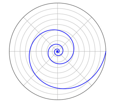 The golden spiral is a logarithmic spiral that grows outward by a factor of the golden ratio for every 90 degrees of rotation (polar slope angle about 17.03239 degrees). It can be approximated by a "Fibonacci spiral", made of a sequence of quarter circles with radii proportional to Fibonacci numbers.