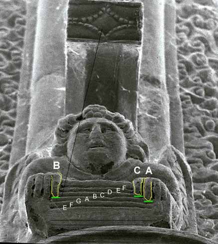2. Using this specially enhanced photo, Thomas and Stuart worked out that the carvings above the angel represent A, B and C.