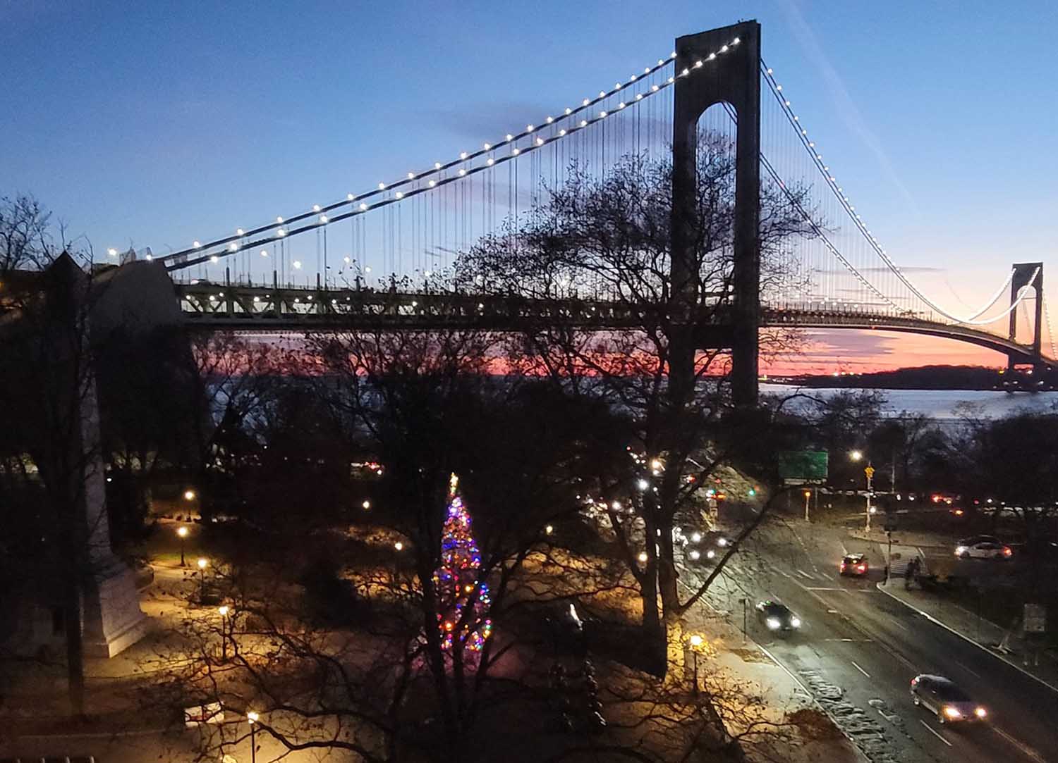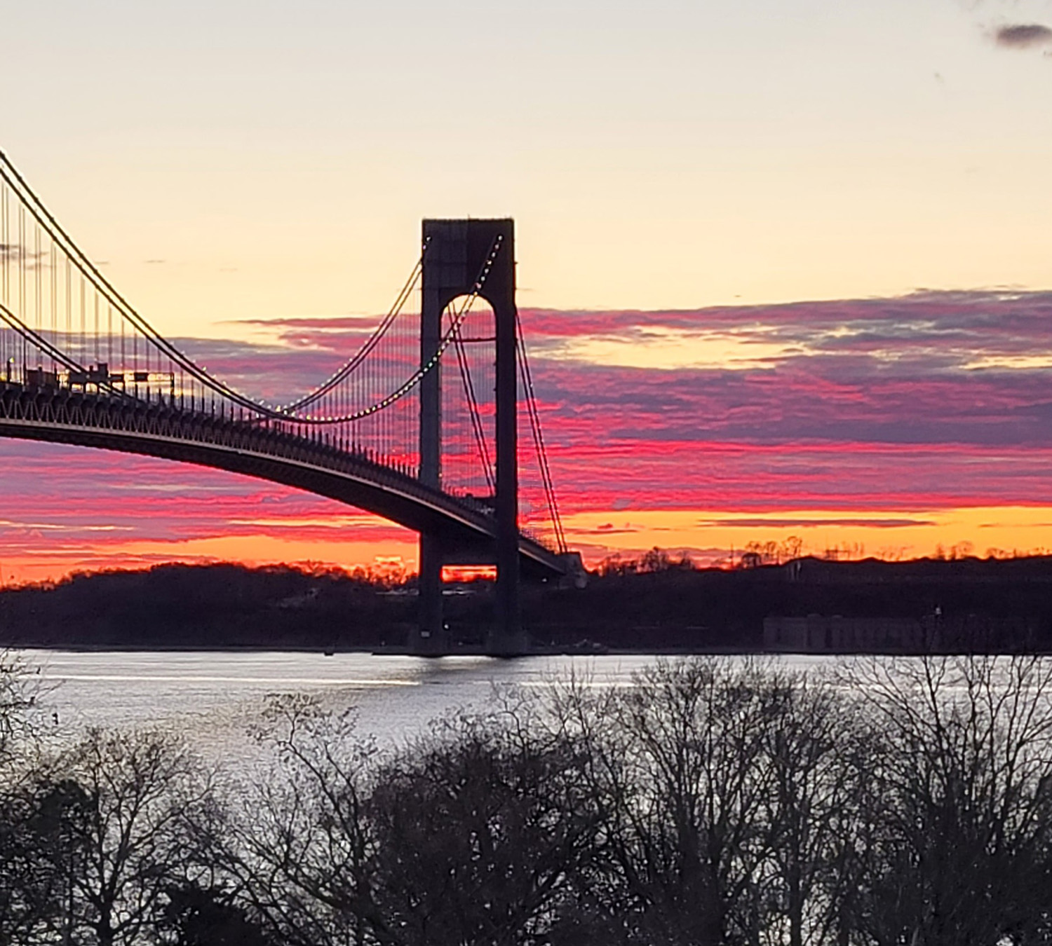 Unique sunset over the Verrazano Beige in shades of red, pink, maroon, yellow, orange, and purple.
