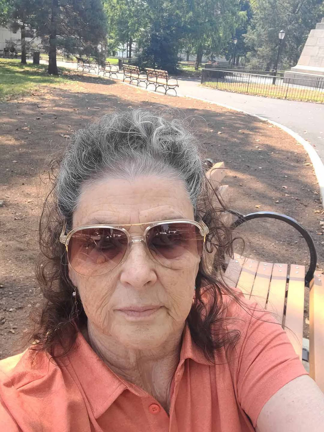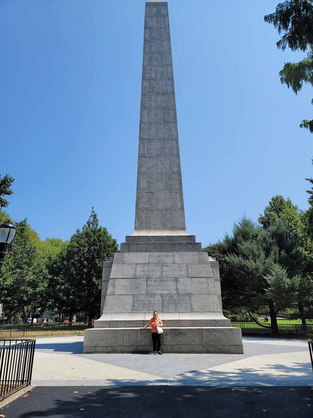 Over the past three months I've watched workers making renovations to the park outside - finally completing the project today. While exploring the changes with my neighbor Lucy - she took this pic of me near the obelisk which now features triangles beside each of the four sides of the base - forming a square depending on how you perceive it.