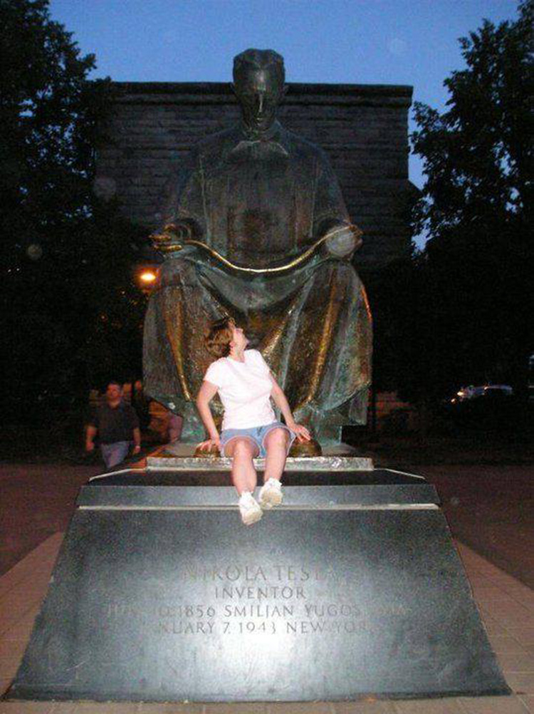 My Nikola Tesla experience isn't as cool as yours but this what happened. I was looking at the book on his statue because I wanted to sit on it but I was scared because it was so big. At that moment my friend took this picture. The picture has an interesting orb beside the book near Tesla's left hand. It looks like I knew it was there! I have always felt a tie to Tesla though far from the scientific type. Wardenclyffe Tower is on my bucket list!