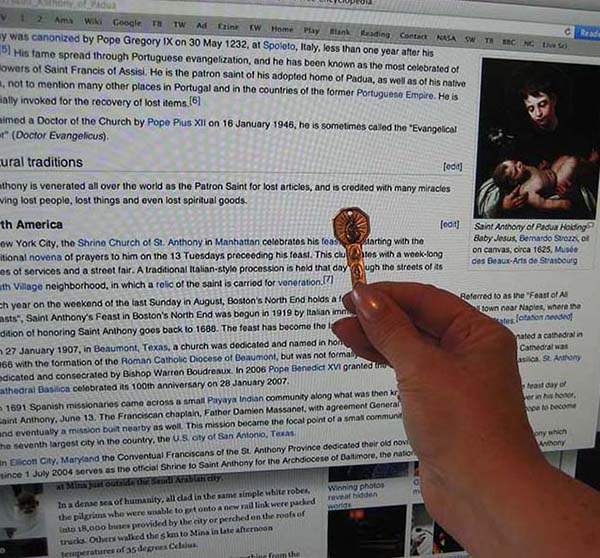 At that moment the clients rang the doorbell and entered the apartment as I stood there holding the key. Coming from Rome, Pamela immediately recognized who was on the key - Anthony of Padua ... And so we went to Wikipedia. I nearly fainted when we read his description. "St. Anthony is venerated all over the world as the Patron Saint for lost articles, and is credited with many miracles involving lost people, lost things and even lost spiritual goods." What are the odds of me reading a client, visiting from Rome, just after finding the key?