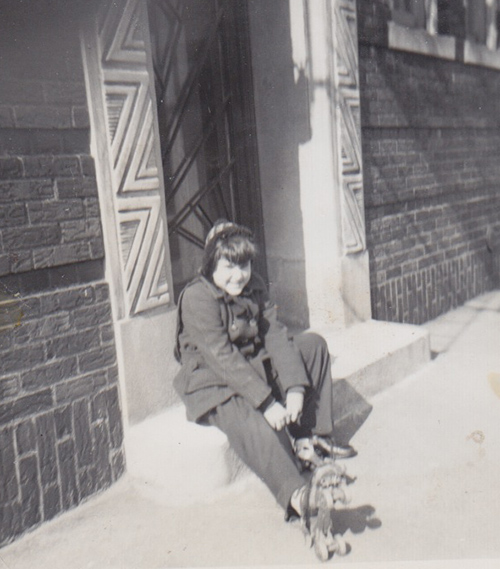 Saturday, October 27 -- Today is my daughter Zsia's (Z) birthday. I woke up dreaming about a metal skate key, which seemed very important. It was time to look at my childhood photo album where I found this photo of me wearing my skates, next to the photo of Diana and I. On the back of the photo my mother wrote, Elinor's 8th birthday, February 17, 1951. On that birthday I entered an 8 Year. (2+17+1951) = 8. The old building looks like it has a series of verticals Z's on either side of the door, as if mirror images of each other, which have now been paved over. The building was owned by a man named Mr. Wade. A few months ago, George and I parked in front of the building and got the strangest stirrings.
