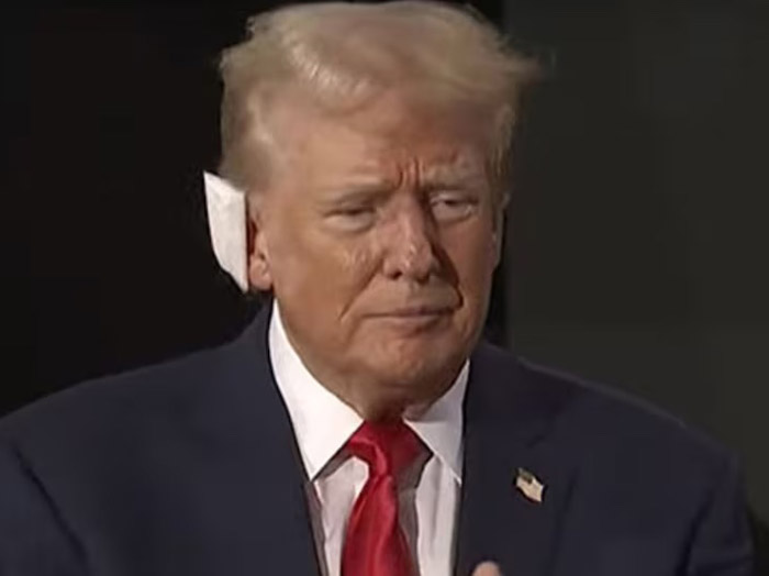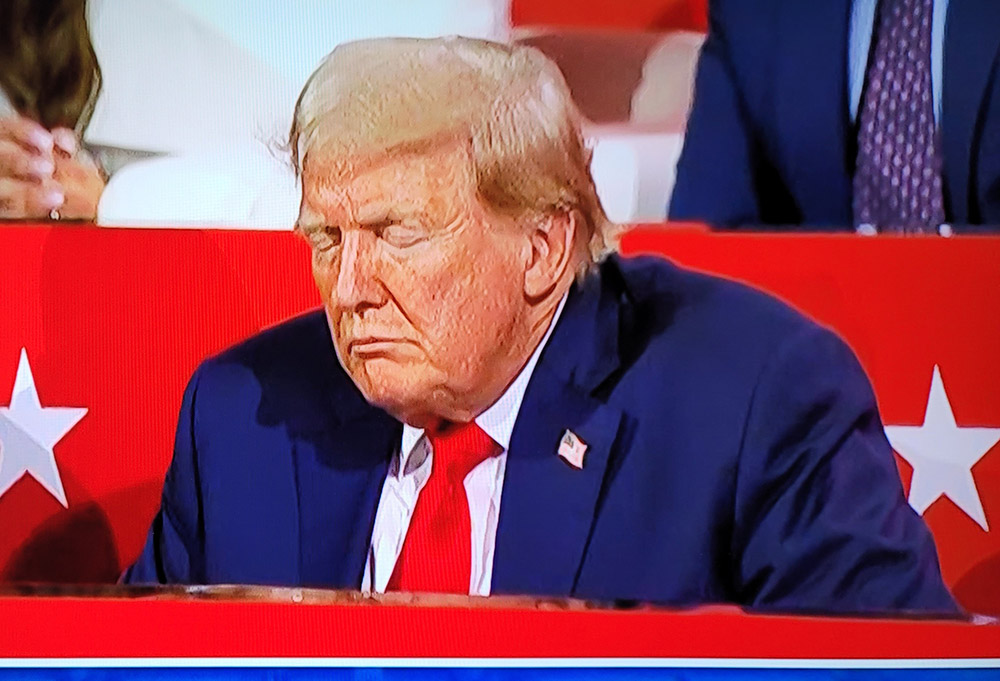 Trump dozing off Monday night at the Republican National Convention. Pain killers, antibiotics, possibly sedatives, trauma, stress, possibly PTSD, combined with old age and exhaustion. This pic is real. I took it with my phone pausing a live recording of the RNC.