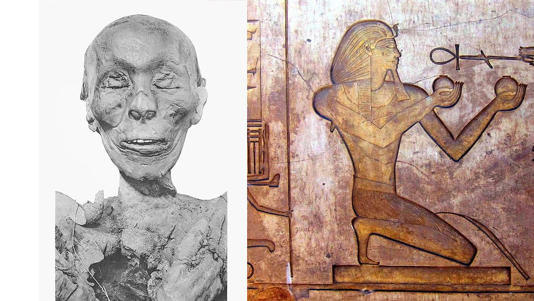 The mummified head of Thutmose II (left) and relief of Thutmose II in Karnak Temple complex.