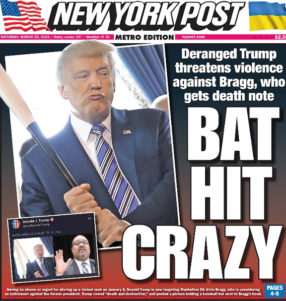 New York Post Shows Trump as a Deranged Bat Wielder Going after District Attorney Alvin Bragg! - Friday March 24, 2023