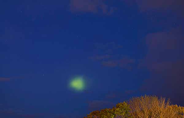 This is neither a UFO nor an aurora above the treeline of North Kingstown, Rhode Island. It's a cloud of barium vapors released by a Black Brant sounding rocket, launched at 8:04 pm EDT on May 16th from Wallops Island, Virginia. Researchers from the University of Alaska are doing an experiment called KiNET-X. Its purpose is to solve a longstanding mystery about auroras. Spaceweather.com Monday