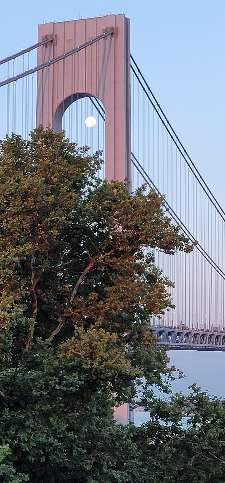 I took this pic of the setting Supermoon harmonizing with the cables of the Verrazano Bridge like 'full notes' creating a celestial symphony to welcome the day. The rising sun made the arches appear pink.