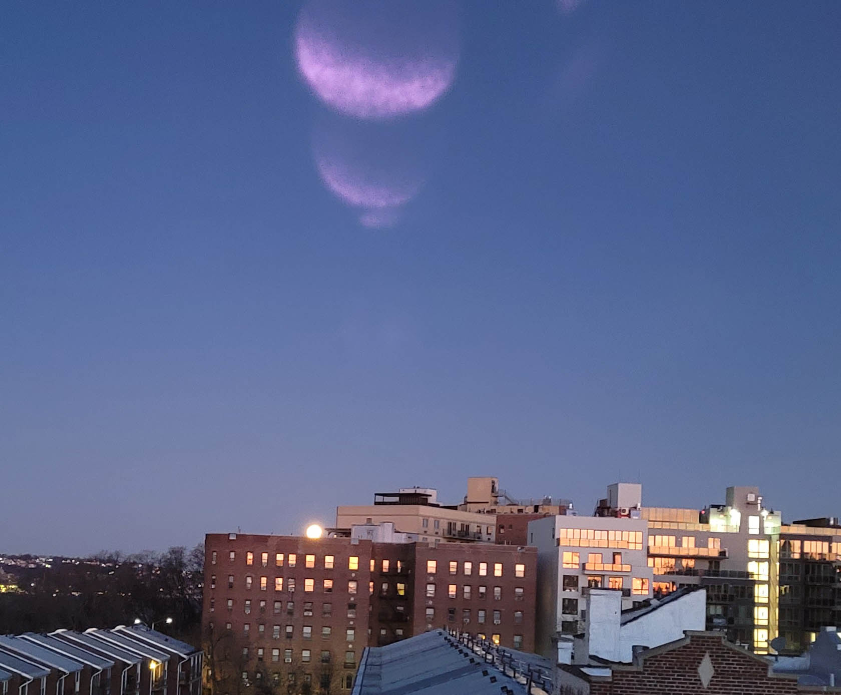 As the almost-full moon set behind the building on the next street - I stepped out on the terrace for a few seconds and took this pic. It was 8° of bone-chilling cold felt through my winter-wear but I wanted to capture the moment. Much to my surprise. - as if looking up at the sky on another planet - there was a purple moon effect.