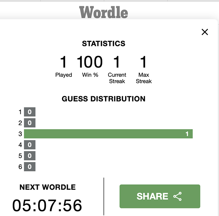 I played Wordle Tuesday for the first time and got the word on the third try.