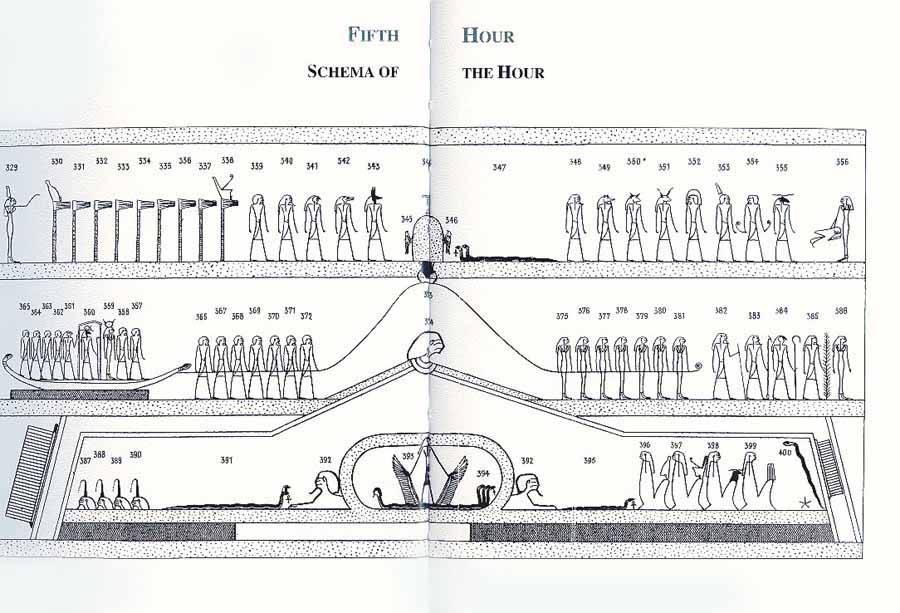 In hour one, the sun god enters the western horizon (akhet) which is a transition between day and night. In hours 2 and 3 he passes through an abundant watery world called 'Wernes' and the 'Waters of Osiris'. In hour 4 he reaches the difficult sandy realm of Sokar, the underworld hawk deity, where he encounters dark zig zag pathways which he has to negotiate, being dragged on a snake-boat. In hour 5 he discovers the tomb of Osiris which is an enclosure beneath which is hidden a lake of fire, the tomb is covered by a pyramid like mound (identified with the goddess Isis) and on top of which Isis and Nephthys have alighted in the form of two kites (birds of prey).