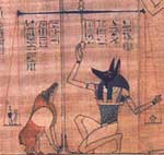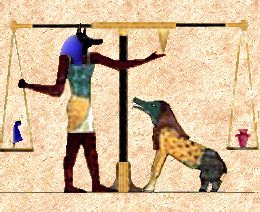 In Egyptian mythology, Ammit (also spelled Ammut, Ammet, Amam, Amemet and Ahemait) was the personification of divine retribution for all the wrongs one had committed in life. She dwelt in the Hall of Ma'at, who was the personification of the concept of truth, balance, and order. In the Ancient Egyptian underworld (known as Duat) hearts of the dead were weighed by Anubis against a feather from Ma'at's headdress. The hearts of those who were heavy with wrongdoing failed the test were given to Ammit for her to devour. Those whose souls were devoured were not permitted to enter Aaru, having to be restless forever - effectively dying a second time. If the heart was lighter than a feather then the soul was judged by the god of the underworld, Osiris.