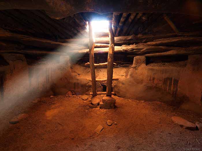 Based on current day Pueblo religious practices, archeologists think of the Anasazi kivas (Hopi language for "old house") as sacred chambers for ceremonies. In the kachina cult (ancestral spirits who bring rain), the Anasazi worshiped the sun, fire and serpents for fertility and agricultural productivity. The kiva is a subterranean room reached by ladder through an opening in the roof. The esoteric symbolism of the hole refers to a man leaving the womb of the earth. These sacred places were always separate from the living quarters, with an average of two kivas per village.