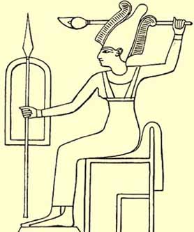 An Egyptian inscription from Beth-Shan shows "Antit" with a plumed crown (very similar to the White Crown of Egypt). In her left hand is the "Scepter of Happiness", and in her right the "Ankh of Life". Iconography at Tanis from the time of Ramesses II shows Anat on a throne with lance, battle ax, and shield above an inscription reading, "To Antit that she may give life, prosperity, and health to the Ka of Hesi-Nekht". <