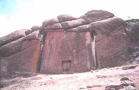 A huge mysterious door-like structure was discovered in the Hayu Marca mountain region of Southern Peru. Hayu Marca, 35 kilometres from the city of Puno has long been revered by local indians as the "City of the Gods", and has never been fully explored because of the rugged mountain terrain. Although no actual city has ever been discovered, many of the rock formations of the region resemble buildings and artificial structures. The door, or the "Puerta de Hayu Marca" (Gate of the gods/spirits) has been at some time in the distant past carved out of a natural rock face and in all measures exactly seven meters in height by seven meters in width with a smaller alcove in the center at the base, which measures in at just under two meters in height.