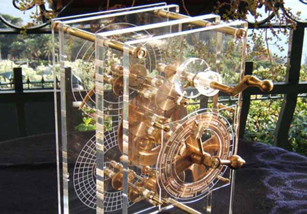 The model recreates each gear and rotating dial to show how the planets, the sun, and the moon move across the Zodiac (the ancient map of the stars) on the front face and the phases of the moon and eclipses on the back. It replicates the now-outdated ancient Greek assumption that all of the heavens revolved around the Earth.