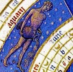 India: Aquarius is the first sign of the zodiac in India, where its patron saint is Varuna. This ancient god was originally the all-powerful lord of all the heavens and creator of the stars. But later he was looked on as just god of the water who looked down on the Earth through the thousand eyes of the stars. From his throat issued the seven streams of heaven. Varuna patrols his realm on a fabulous steed, half crocodile and half bird. So he is quite able to patrol both the air and the sea. Around 3000 BC it was possible to observe the full moon in this constellation every year around the time of the summer solstice, an event that was cause for celebration. This time represented the triumph of the moon god, Chandra, when he reached his maximum splendor and was drunk by the sun, Indra. Chandra was also identified with the magical drink of the gods, soma. With the sun crossing the solstice and the lengthening of daylight, the evil god of darkness and drought, Vritra represented by the constellation Hydra, was conquered. In India, the summer solstice corresponds with the return of the monsoon season and water to the land.