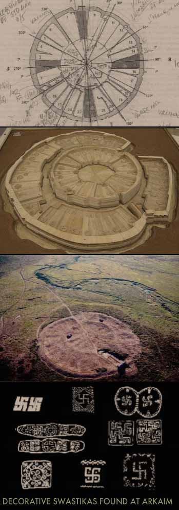 Measurements confirmed that the ancients of the Southern Ural were aware of the phenomenon of the precision of the EarthÕs axis expressed in ratios of the internal circle. The period of this phenomenon is enormous - 25,786 years, but ArkaimÕs builders portrayed corresponding parameters perfectly and very precisely. Researchers specifically note that in order to create this sort of observatory they had to know that the Earth has the form of a sphere and together with other planets spins around the Sun... (On ArkaimÕs ceramic ware, the sacred sign for the Òsun wheelÓ, a swastika was found.) Another surprise is that the city itself, and mortuary facilities in its plan, represent the combination of a circle and a square.