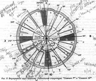 In the erection of the ring-shaped internal wall they used a circle with a radius measuring 52.65 of ArkaimÕs linear measures (one Arkaim linear measure equals 80.0 cm) that corresponds to 52° 39' the latitude of Arkaim. The latitude of Arkaim, by the way, is close to the latitude of Altai barrow Arjan (52° 00 ') and Stonehenge (51° 17'), and it is possible that this strip on the EarthÕs surface, as well as the 30th parallel, had significant meaning for ancient astronomers and priests.