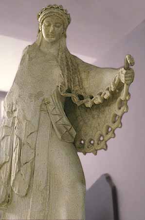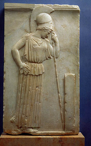 The Mourning Athena is a relief sculpture that dates around 460 BC and portrays a weary Athena resting on a staff. In earlier, archaic portraits of Athena in Black-figure pottery, the goddess retains some of her Minoan character, such as great bird wings, though this is not true of archaic sculpture such as those at Aphaea. Other common types of Athena statue may be found here.