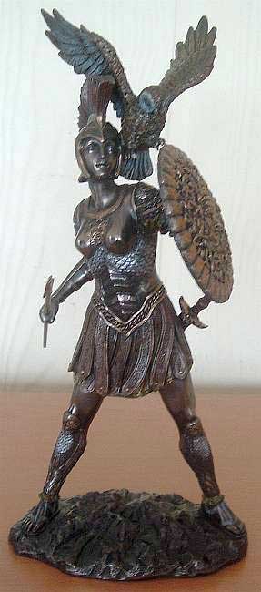 She is attended by an owl, and is often accompanied by the goddess of victory, Nike. Wearing a goatskin breastplate called the Aegis given to her by her father, Zeus, she is often shown helmeted and with a shield bearing the Gorgon Medusa's head, a votive gift of Perseus.
