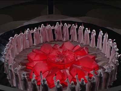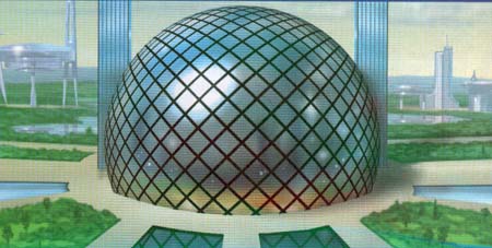 He selects one of the symbols and passes his small chubby hands over it; an expectant silence fills the Hall. Following Ec-kar's gaze they turn towards the center of the room, watching as the bright clear light gradually appears in the empty air at the middle of the space. As the light grows in intensity, colors appear and radiate outward, up to the ceiling, - a hundred feet high - and out to the walls, bathing the students and Ec-Kar in a rainbow glow. In a matter of seconds the light disappears, suddenly replaced by what appears to be an enormous, and very solid, dome-shaped structure.