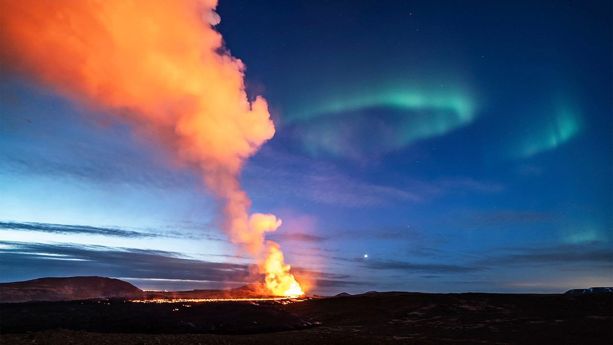Auroras above lava flowing from a volcano near Grindavik, Iceland - March 24, 2024