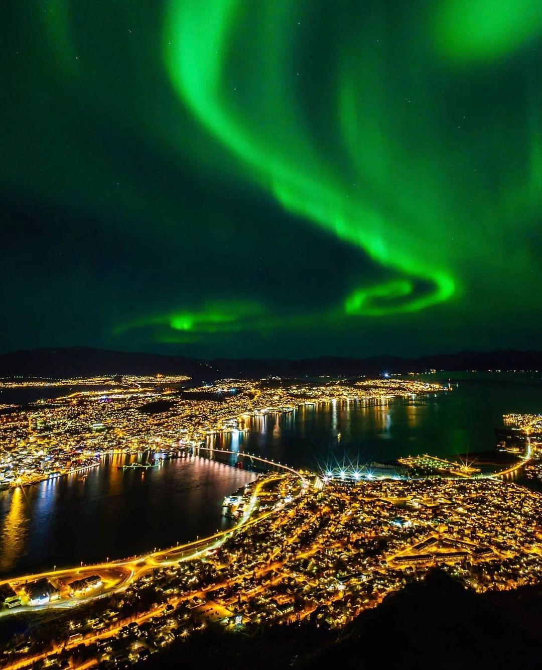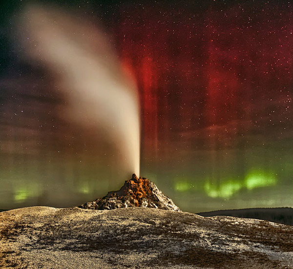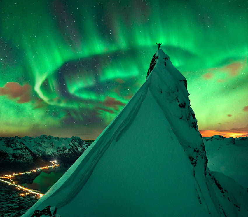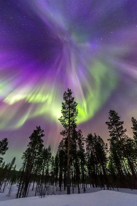 Taken by astrophotographer Jeff Dai, a stunning green aurora is seen at its zenith - the highest point in the sky - so we are getting a view of the event from below. The curtain of light is seen curling as though vibrations are going through it, before straightening out again.