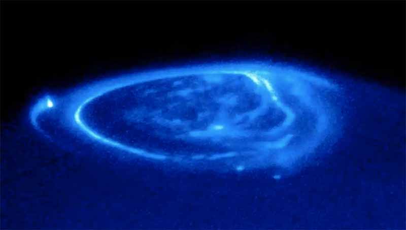 For example, several of Jupiter's moons, including Io, Ganymede and Europa, affect the blue aurora created by the solar wind. Io, which is just a little larger than our own moon, is volcanic and spews out vast amounts of charged particles into Jupiter's magnetosphere, producing large electrical currents and bright ultraviolet (UV) aurora.