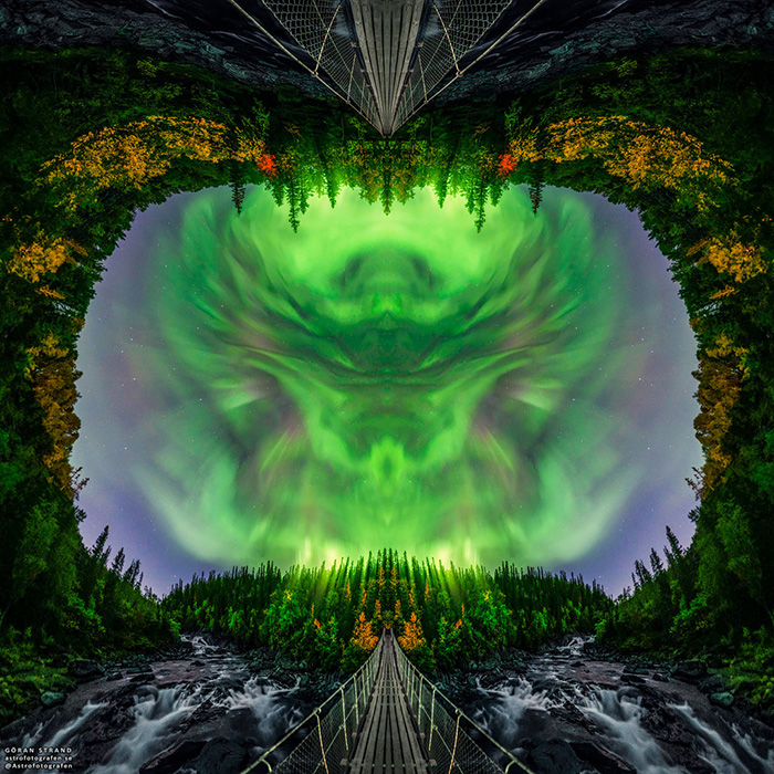 Explanation: If you see this as a monster's face, don't panic. It's only pareidolia, often experienced as the tendency to see faces in patterns of light and shadow. In fact, the startling visual scene is actually a 180 degree panorama of Northern Lights, digitally mirrored like inkblots on a folded piece of paper. Frames used to construct it were captured on a September night from the middle of a waterfall-crossing suspension bridge in Jamtland, Sweden. With geomagnetic storms triggered by recent solar activity, auroral displays could be very active at planet Earth's high latitudes in the coming days. But if you see a monster's face in your own neighborhood tomorrow night, it might just be Halloween. - Goran Strand