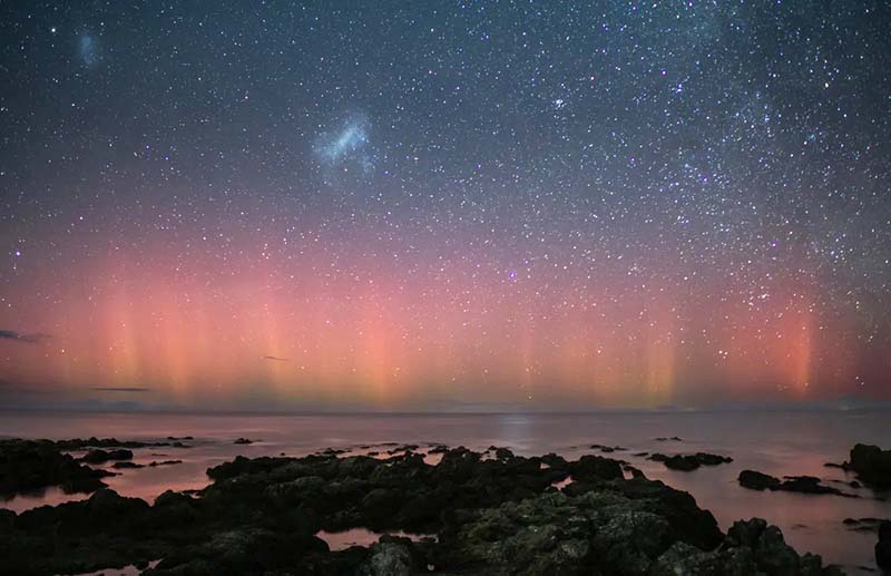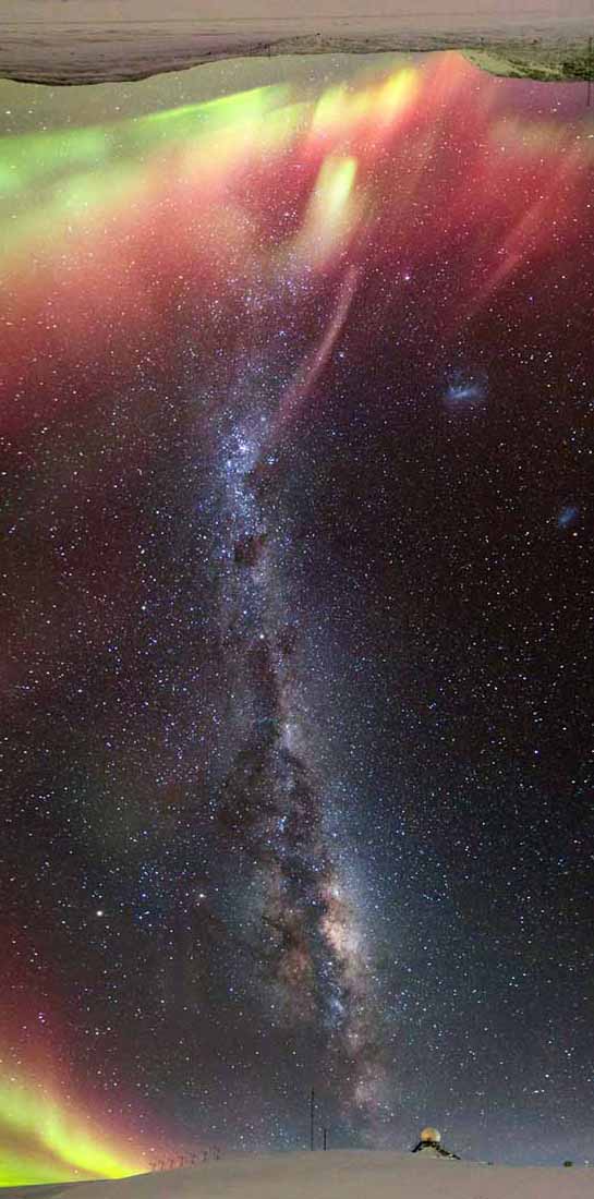Its southern counterpart, the aurora australis (or the southern lights), has almost identical features to the aurora borealis and changes simultaneously with changes in the northern auroral zone and is visible from high southern latitudes in Antarctica, South America, New Zealand and Australia.