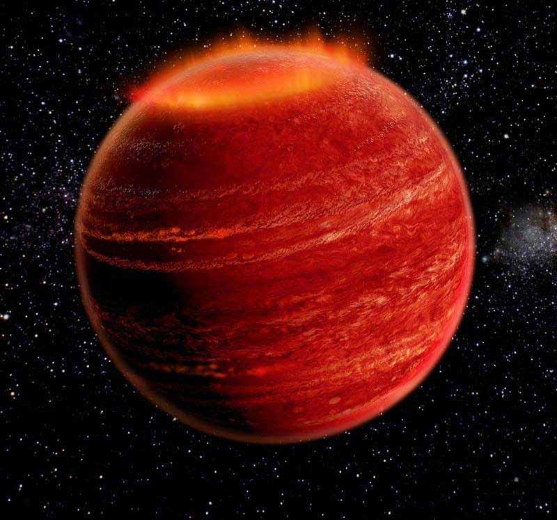 The brown dwarf star LSR J1835+3259 was discovered to have auroras in July 2015, the first extra-solar auroras discovered. The aurora is a million times brighter than the Northern Lights, mainly red in color, because the charged particles are interacting with hydrogen in its atmosphere. It is not known what the cause is. Some have speculated that material maybe being stripped off the surface of the brown dwarf via stellar winds to produce its own electrons. Another possible explanation is an as-yet-undetected planet or moon around the dwarf, which is throwing off material to light it up, as is the case with Jupiter and its moon Io.