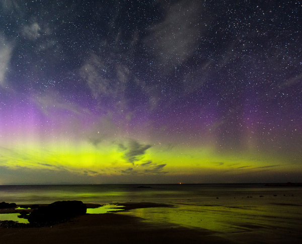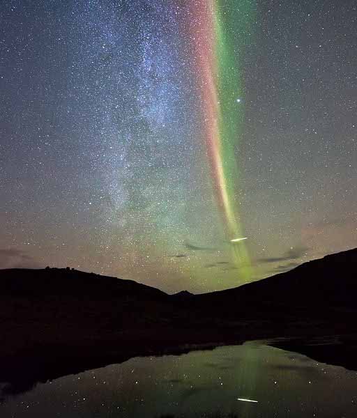 Black auroras over Scotland. Note the dark vertical strip above the green band, which is devoid of any normal auroral color.
