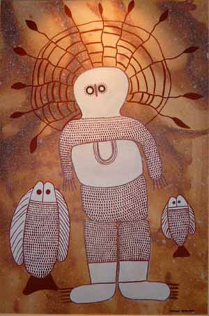 Art is a link to the ideological realm for male artists who depict totemic species and ancestral and mythological figures. This highly structured art is an affirmation that the artist is meeting his responsibilities to the ancestral world, actually maintaining it in some way. Aboriginal people say that men's art has "meaning." It communicates information about Dreaming stories and is tied to land and rights of inheritance.