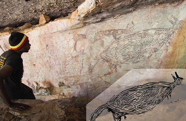 A red ochre painting discovered at the centre of the Arnhem Land plateau about two years ago depicts two emu-like birds with their necks outstretched. They have been identified by a paleontologist as depicting the megafauna species Genyornis. The giant birds were thought to have become extinct more than 40,000 years ago but this may suggest that they existed later than that.