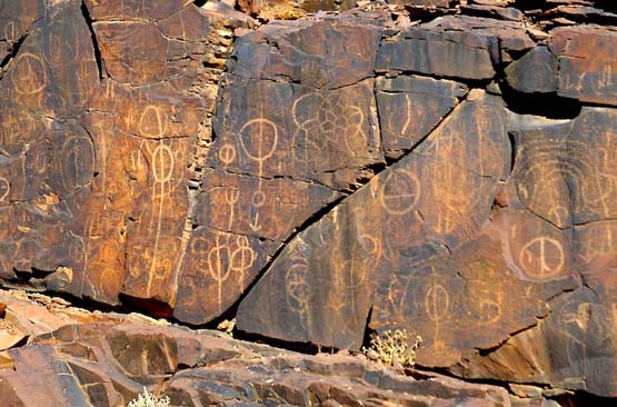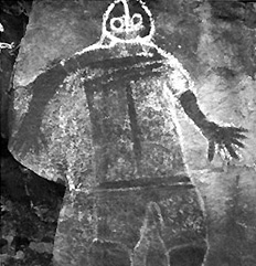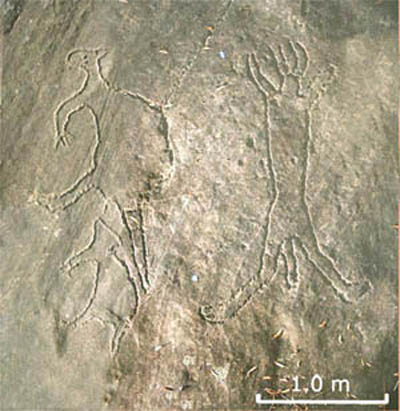 Carved in the mountainside are huge rock petroglyphs of eagle and Hawk-headed beings in canoes going down a river. These petroglyphs allegedly date 40,000 to 60,000 years. The Aborigines who live in the area say that this is the 'site of creation'. There are pictures that match some of the crop circle formations and some of the ancient Egyptian hieroglyphs. Interpretations of the petroglyphs is that they depict visitors from other worlds who came here in spaceships long ago, perhaps to seed the human race. May believe these visitors will return.
