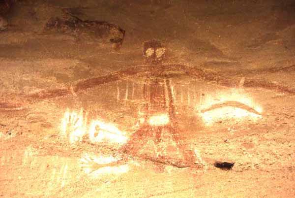 In rock paintings Baiame is often depicted as a human figure with a large head-dress or hairstyle, with lines of footsteps nearby. He is always painted in front view; Daramulum is drawn in profile. Baiame is often shown with internal decorations such as waistbands, vertical lines running down the body, bands and dots. The dots are said to have given him power over smallpox.