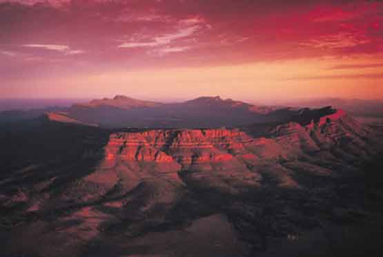 Wilpena Pound is a natural amphitheatre of mountains located 429 kilometres north of Adelaide, South Australia, in the heart of the Flinders Ranges National Park. The Pound is the most northern point with access via a sealed road in this part of the Flinders Ranges. The closest town to the north is Blinman and to the south, Hawker. Attempts at farming the pound failed during the early 20th century. Following this the tourism potential was recognized in 1945. The Flinders Range contains some of the most unusual geological formations in Australia. Indications of gigantic electric arcs are unmistakable.