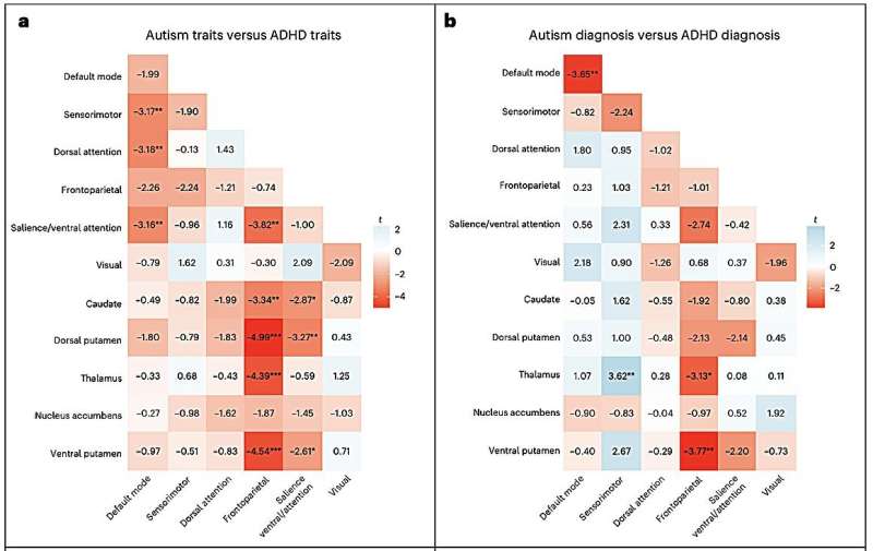 Autism spectrum disorder (ASD) and attention-deficit/hyperactivity disorder (ADHD) are among the most well-known neurodevelopmental conditions, estimated to affect approximately 1-3% and 5-7% of the global population, respectively. While people diagnosed with ASD can experience difficulties with social communication, repetitive behaviors and a heightened sensitivity to sensory stimuli (e.g., lights, sounds, etc.), those diagnosed with ADHD are often prone to hyperactivity, impulsivity and inattention, which makes it harder for them to focus on tasks for extended periods of time. ADHD and autism often co-occur, with statistics estimating that 50-70% of individuals with ASD also present symptoms of ADHD. While several past neuroscience studies investigated these two distinct neurodevelopmental conditions, the similarities and differences between their neurobiological underpinnings remain poorly understood.