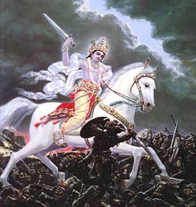 In Hinduism, Kalki (alt. spelling: Kalaki) ('Time") is the tenth and last avatar of Vishnu. Kalki is expected to appear on Earth at the conclusion of the current Kali Yuga; He will come from the sky on a white horse, brandishing a flaming sword with which to destroy the wicked people of the current world, renew creation and bring righteousness back to Earth.