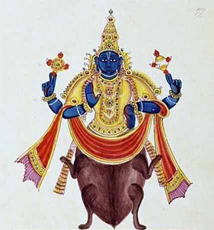 Varaha is depicted in art as either purely animal or as being anthropomorphic, having a boar's head on a man's body. In the latter form it has four arms, two of which hold the wheel and conch-shell and the other two hold a mace, sword or lotus or form a blessing posture. The earth is held between the boar's tusks.The avatar symbolizes the resurrection of the earth from a pralaya (deluge) and the establishment of a new kalpa (cycle), and can thus be considered to constitute a creation myth. The Varaha purana is a purana in which the form of narration is a recitation by Varaha. A very ancient temple lies in Tamil Nadu goes by the name of Sri Mushnam, and is considered a "svayambhu" murthi like Tirupati and Badrinath.