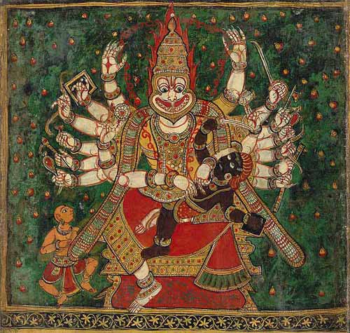 He is often visualized as half-man/half-lion, having a human-like torso and lower body, with a lion-like face and claws. This image is widely worshiped in deity form by a significant number of Vaishnava groups, particularly in Southern India. He is known primarily as the 'Great Protector' who specifically defends and protects his devotees in times of need.