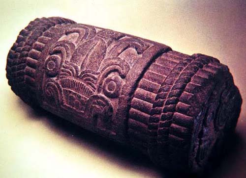 Xiuhmolpilli commemorative sculpture marking the completion of the fifty-two-year cycle. Every 52 years the tonalpohualli and the xiuhpohualli calendars would align. This marked what was known as a Mesoamerican "century." Every one of these centuries was marked by xiuhmolpilli - Binding Up of the Years or the New Fire Ceremony. This was a festival that lasted 12 days and included fasting as a symbol of penitence. At the beginning of this festival all the lights in the city were extinguished - people let their hearth fires go out. Then on midnight of the 12th day of the festival, a prisoner was taken to the priest. The priest would watch in the night sky for the star of fire to reach the zenith. Once it did, the priest would remove the heart of this man, and replace it with a piece of wood, that was laid on a piece of turquoise. This is where the priest would start the new fire that would once again light the city.