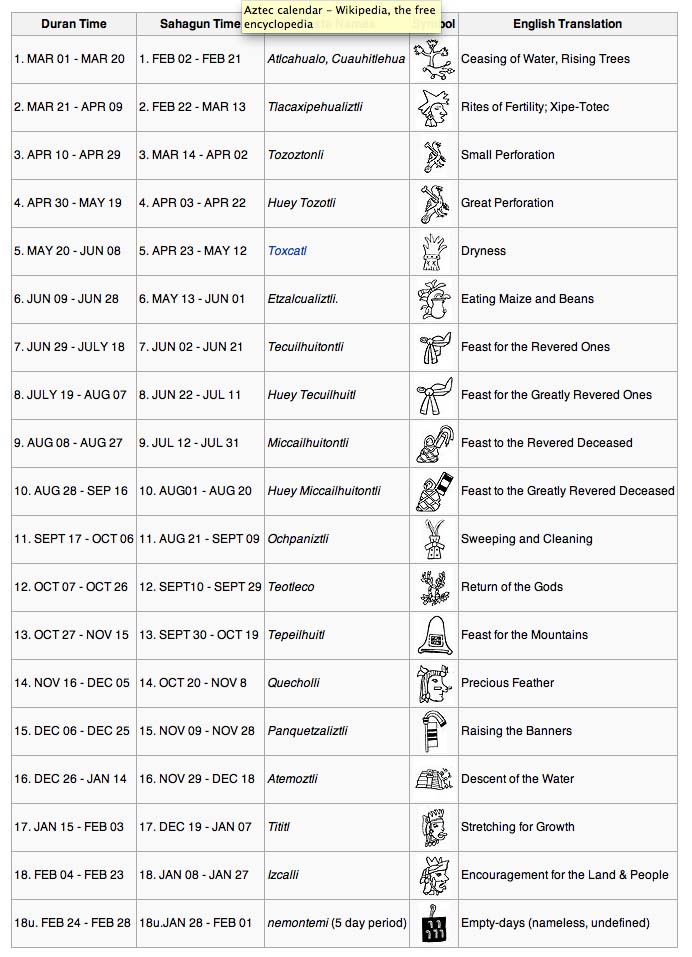 Each 20 days period started on Cipactli (Crocodile) for which a festival was held. The eighteen veintena are listed below. The dates are from early eye-witnesses. Each wrote what they saw. Bernardino de Sahagin's date precedes the observations of Diego Duran by several decades and is believed to be more recent to the surrender. Both are shown to emphasize the fact that the beginning of the Native new year became non-uniform as a result of an absence of the unifying force of Tenochtitlan after the Mexica defeat.