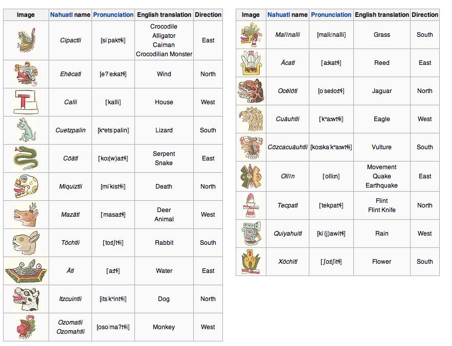 The set of day signs used in central Mexico is identical to that used by Mixtecs, and to a lesser degree similar to those of other Mesoamerican calendars. Each of the day signs also bears an association with one of the four cardinal directions.