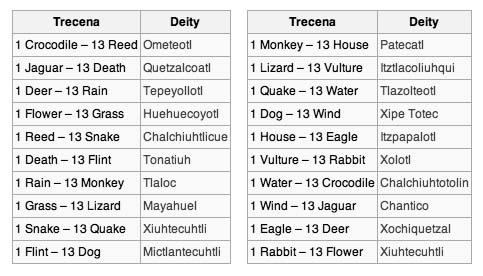 A set of thirteen numbered days is known by the Spanish term trecena (from trece "thirteen"). Each of the twenty trecenas in the 260-day cycle was associated with a particular deity: